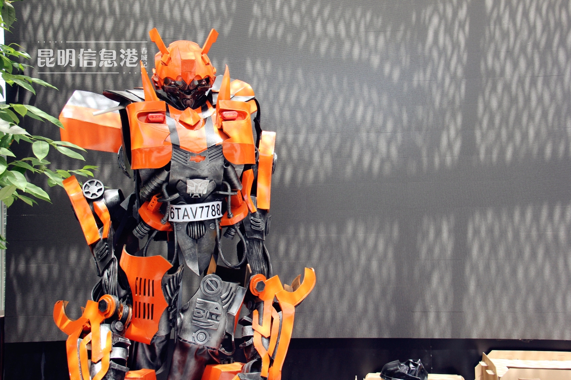 步入中庭,3米多高的可穿戴式变形金刚引人注目,它可以容纳一个成年人穿戴操控。这块巨型电子屏也是由田锦林自行拼接制作。