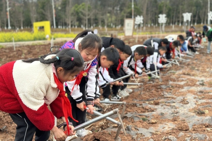 在教育部“强化实践育人”的号召下,学校打破学科壁垒,又将课堂搬进真正的田野!学生们在校外劳动实践基地,进行沉浸式劳动实践,安全教育、生态教育与艺术教育在春风中自然生发。学校办学以来用多样化教育教学活动铺展出一卷五育融合的育人长图,以《深化新时代教育评价改革总体方案》为纲,将德智体美劳全面发展的种子播撒在希望的田野上,让教育回归“培根铸魂、启智润心”的本质追求。既是“五育并举”的校本答卷,更是中国教育“为党育人、为国育才”的铿锵回响——因为今日田间播下的不只是花生种子,更是为少年们注入破土而出、茁壮成长的力量。